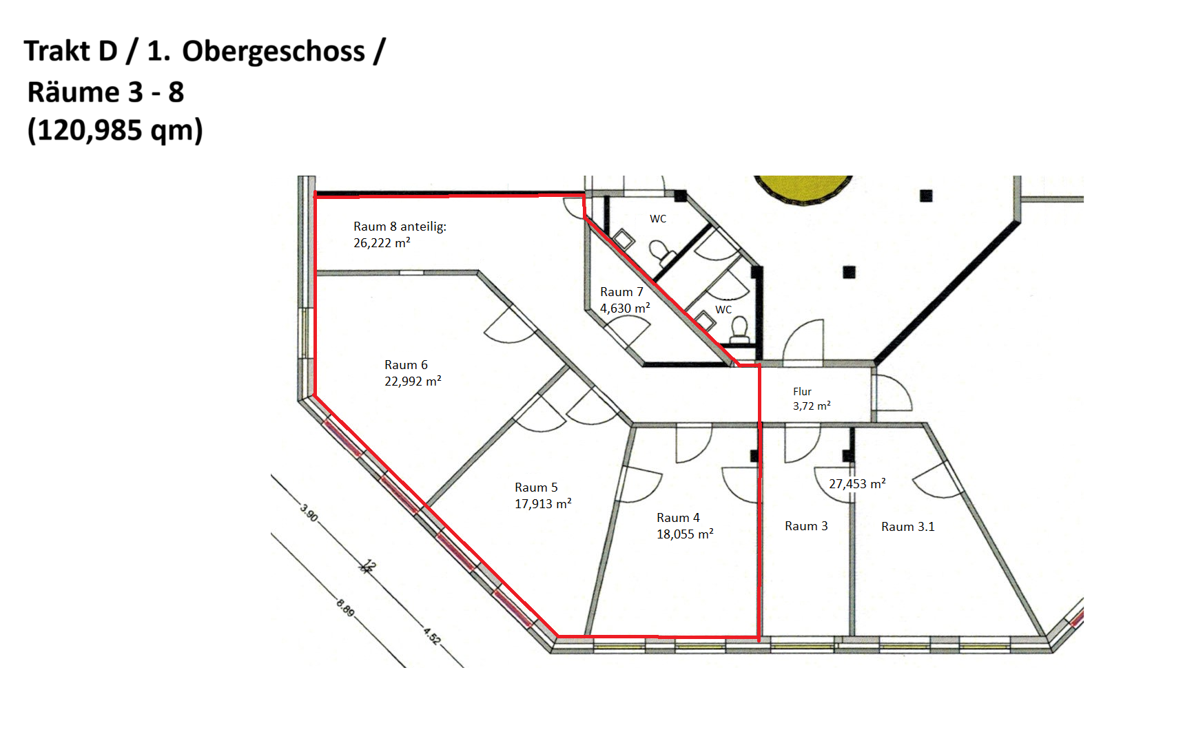 Die angebotene Büroeinheit im 1. Obergeschoss des Gebäudes besteht aus einem Flur von dem 5 kleinere Büroräume und ein kleines Lager abgehen. In Raum 7 ist eine eingebaute Küche, die sie vom Vormieter, für ein kleines Entgelt, übernehmen können.