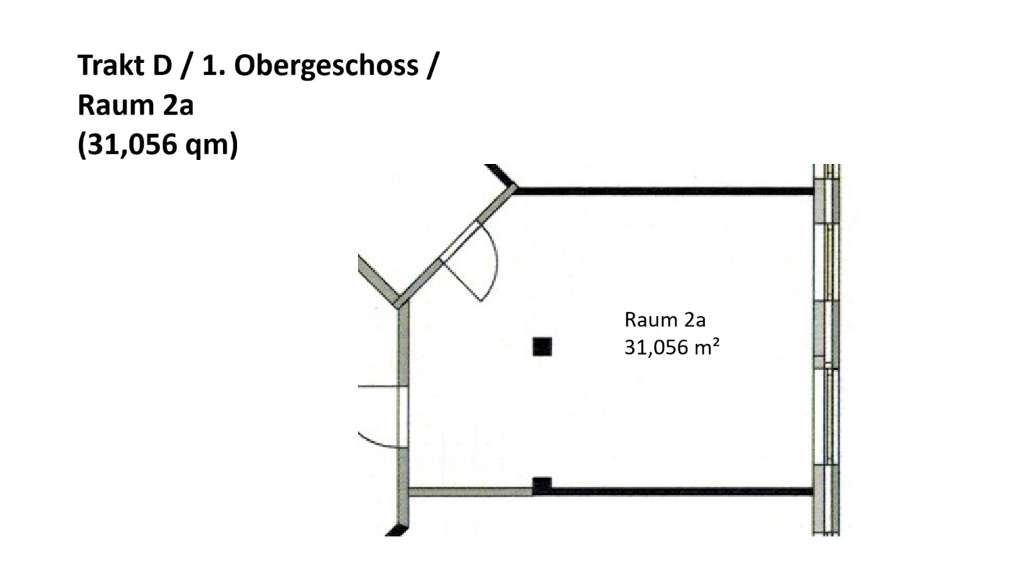 Die Bürofläche im 1. Stock bietet mit seinen 31,056 qm einen ruhigen und hellen Arbeitsplatz. Der Fußboden ist mit einem Teppichboden ausgelegt.